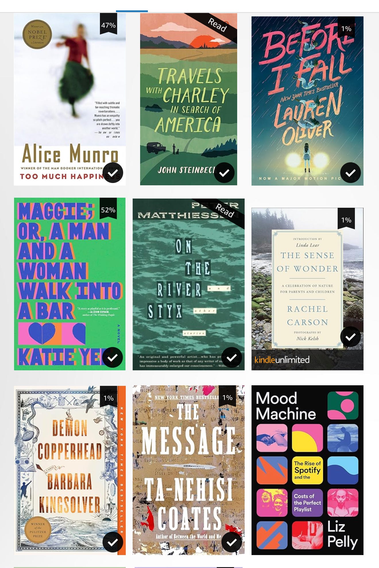 This year, I’ve also read plenty of shorter books too. In the last few months: The Moon Is Down by John Steinbeck, Notes from Underground by Fyodor Dostoevsky, How to Think About Exercise by Damon Young, Meander, Spiral, Explode: Design and Pattern in Narrative by Jane Alison; Maggie, Or: A Man and a Woman Walk into a Bar by Katie Yee; Red Doc> by Anne Carson. Those are not big books.