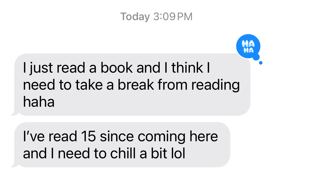 Some very important context here: I do not speed-read. I have never consciously tried to “speed up” my reading, employ any strategies, or overall impose some sort of structure onto how I consume words. I’m speaking about my natural rate, which just happens to be fast, plus behavioral factors that impact how I prioritize reading as an activity within my day-to-day.