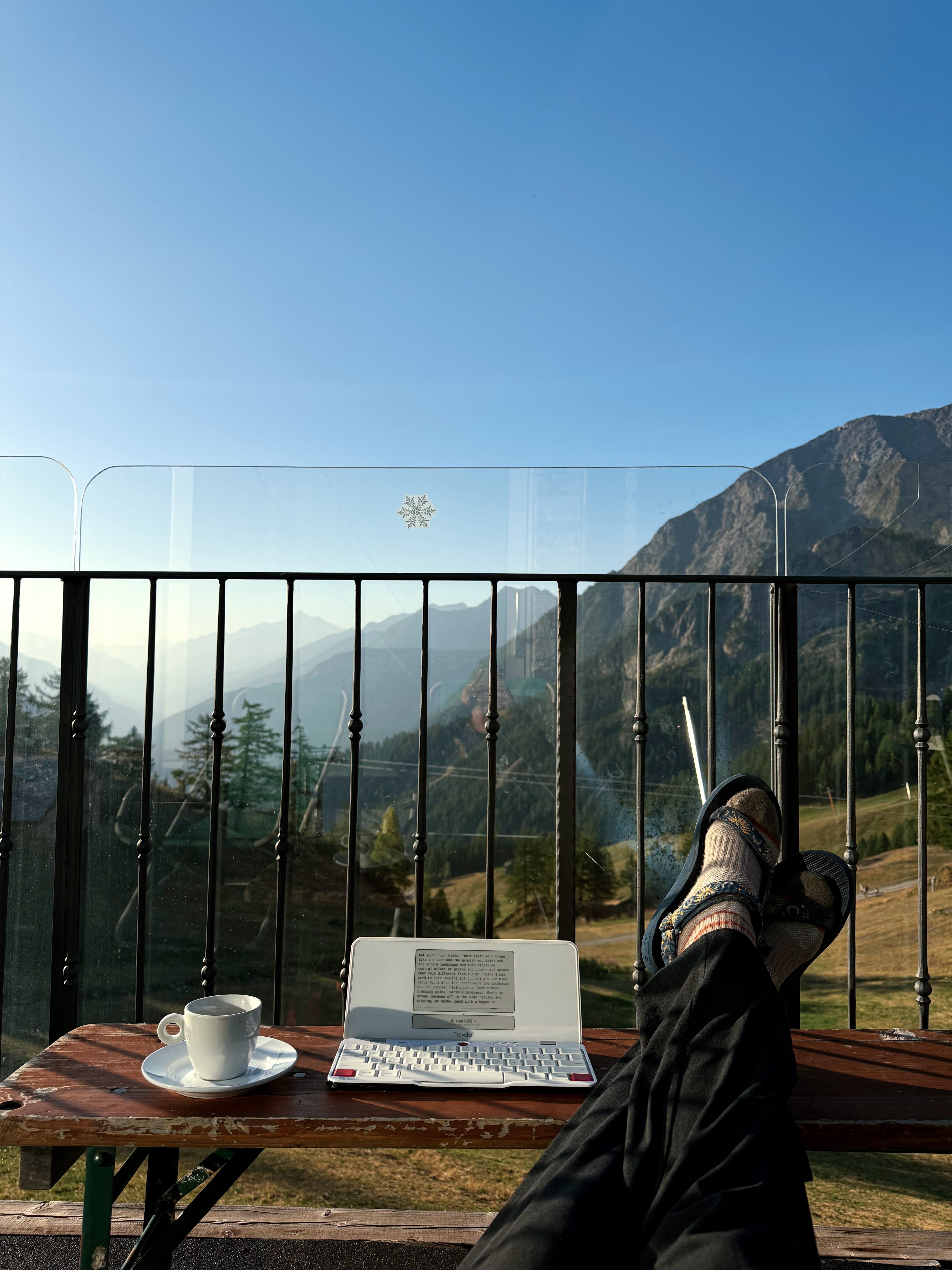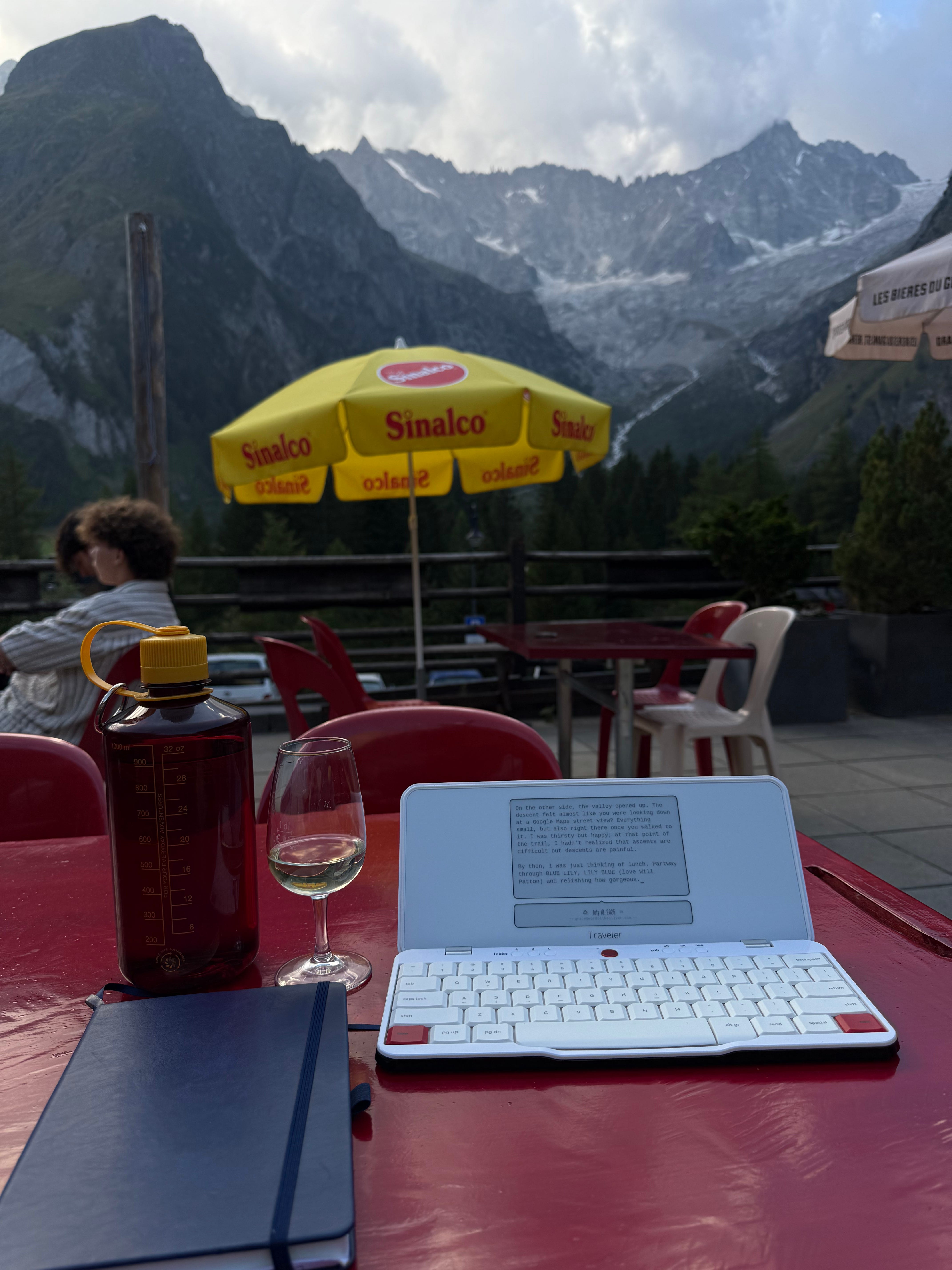 Being able to type outside really has been the mental game-changer for me. I actually took this backpacking with me on the Tour du Mont Blanc in August; it was the heaviest item in my backpack at 1.6 lbs, but was so worth it. I got to write at 7 a.m. with my coffee overlooking the mountains before hitting the trail.